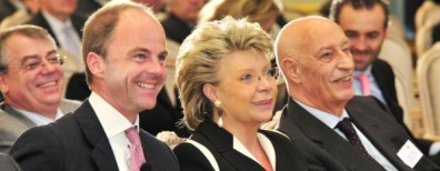Strahlende Gesichter auf dem Gipfel. Bei Dr. Christian Göke (links) kein Wunder: schließlich konnte der Geschäftsführer der Messe Berlin gerade für seine ITB Asia den Innovationspreis der deutschen Tourismuswirtschaft entgegennehmen. Die Vizepräsidentin der Europäischen Kommission, Viviane Reding, lächelt tapfer, weil sie höflicherweise nicht ausgebuht wurde für ihre weitgehenden Verbraucherschutz-Ideen, die den meisten Anwesenden im Saal erheblich zu weit gingen. Und Klaus Laepple war zufrieden, eben jene Pläne mit vereintem Lobbyismus um mindestens ein Jahr verzögert zu haben..