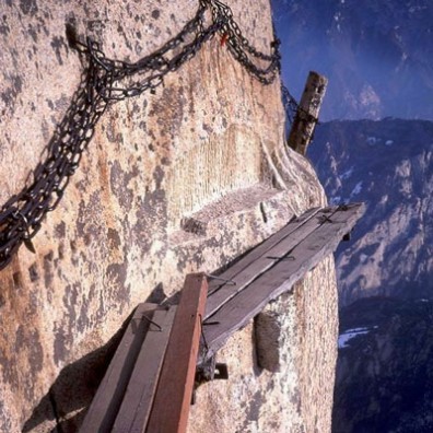 In der Nähe der chinesischen Stadt Xi’an gibt es einen Höhensteig, der die meisten Wanderer an die Grenzen ihrer Höhenangst führen dürfte. Er führt auf den Mt. Hua Shan. Erst über unendliche Himmelsstiegen nach oben und dann über wackelige Planken an senkrechten Steilhängen; nur gesichert durch rostige Eisenketten. Wer durchkommt, den empfängt ein Teehaus in einem taoistischen Tempel. Den Beruhigungstee hat man dann aber auch wirklich nötig…